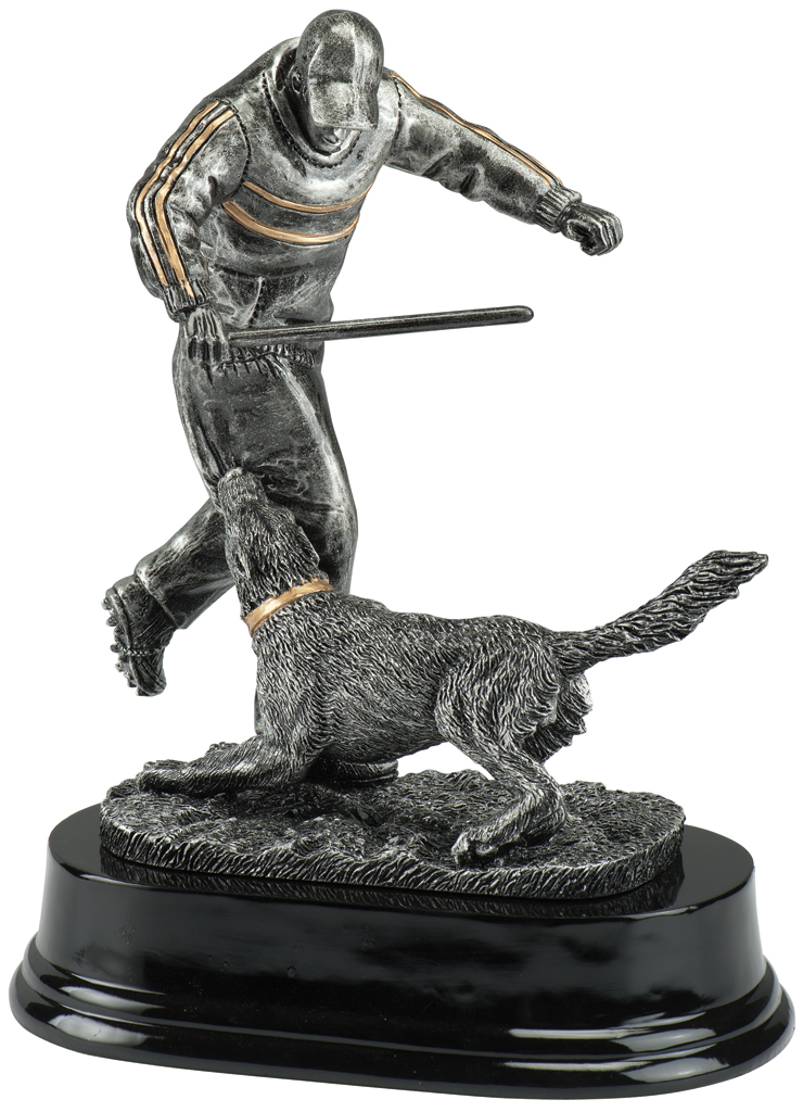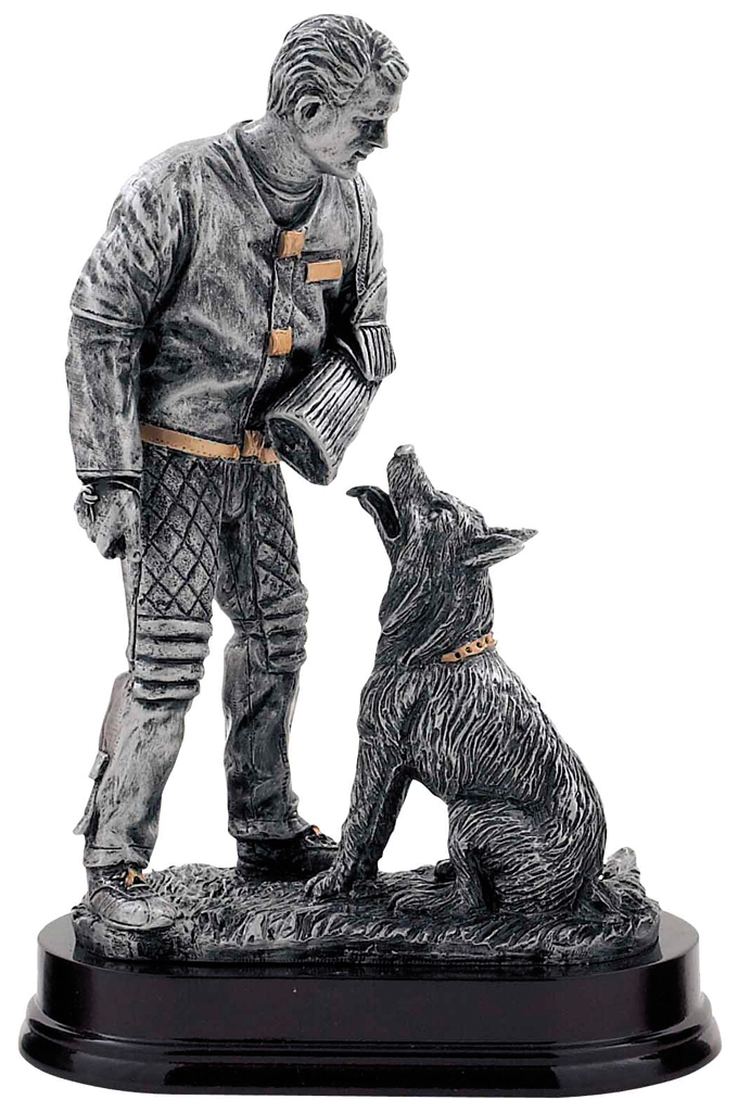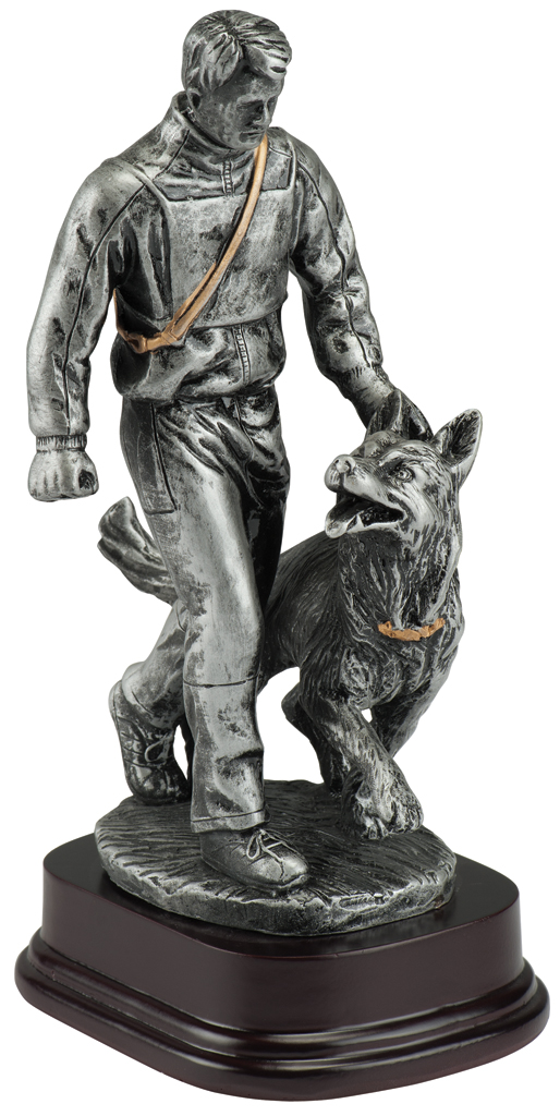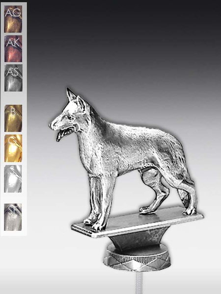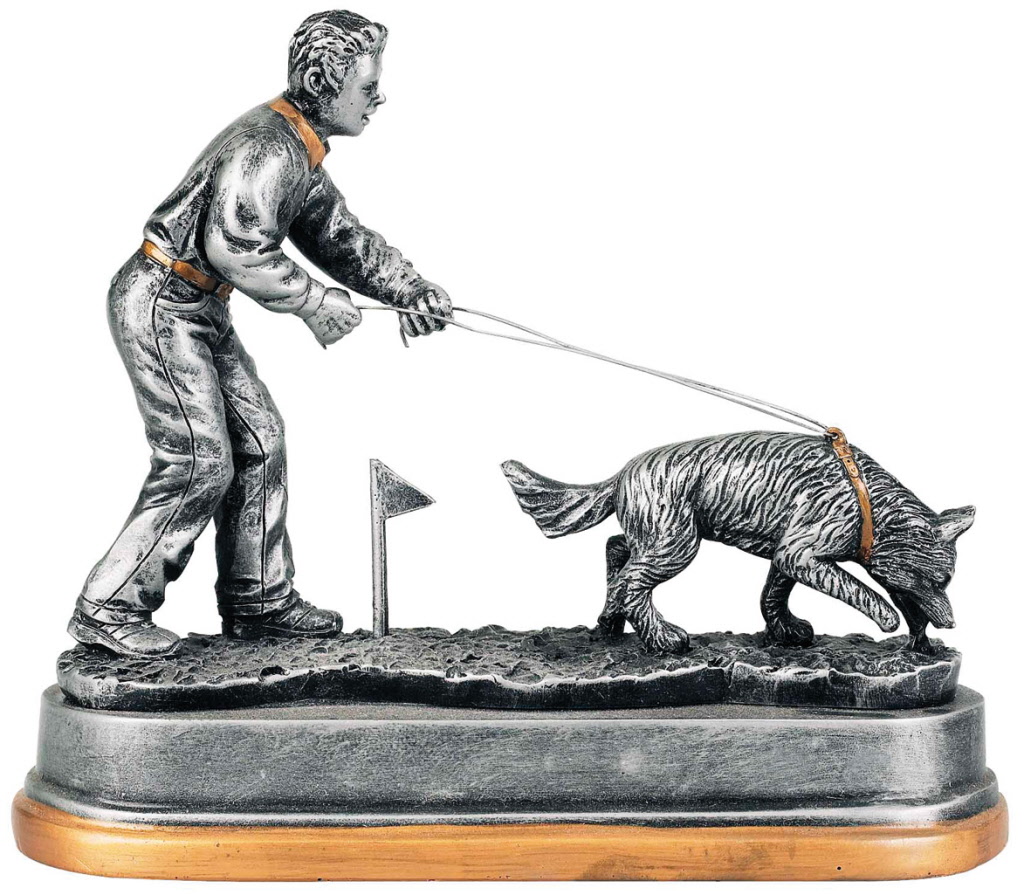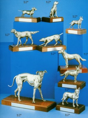 Diverse prachtige zilveren metalen beelden van honden op een houten sokkel.