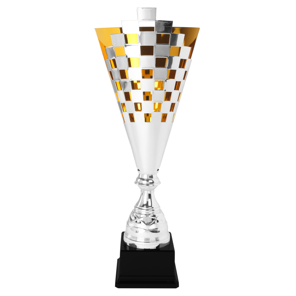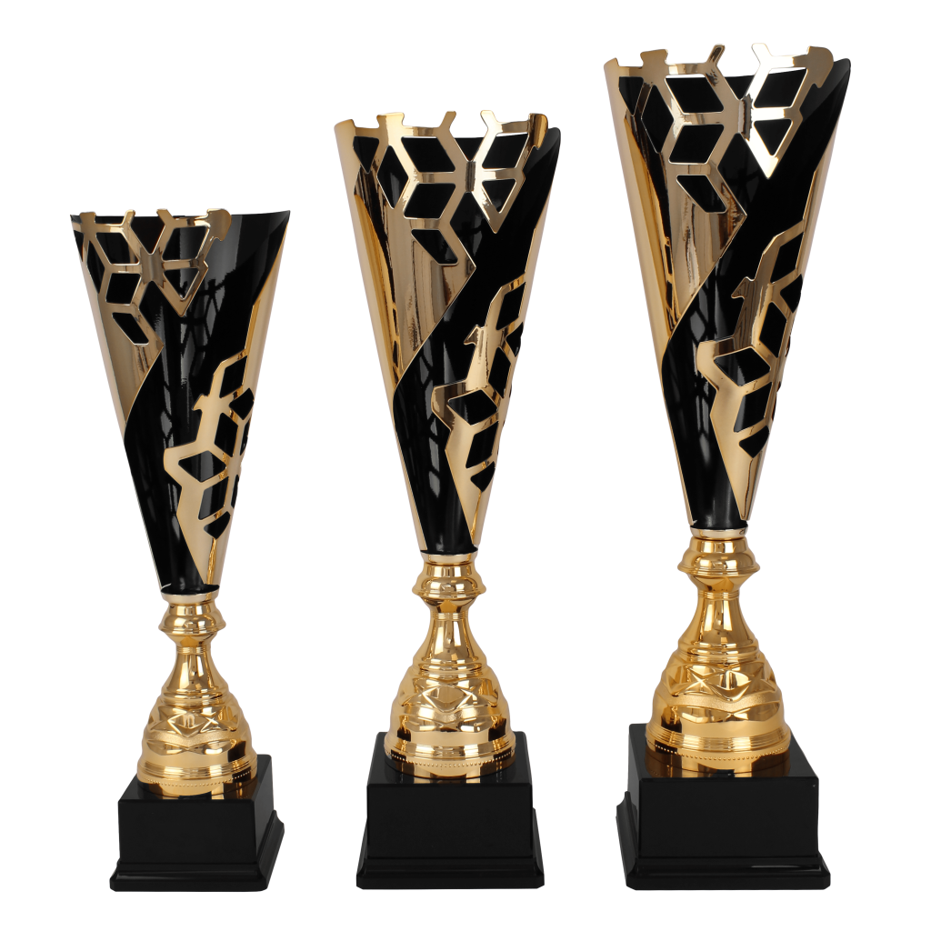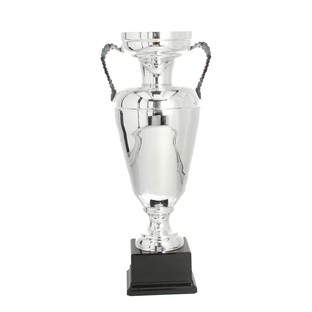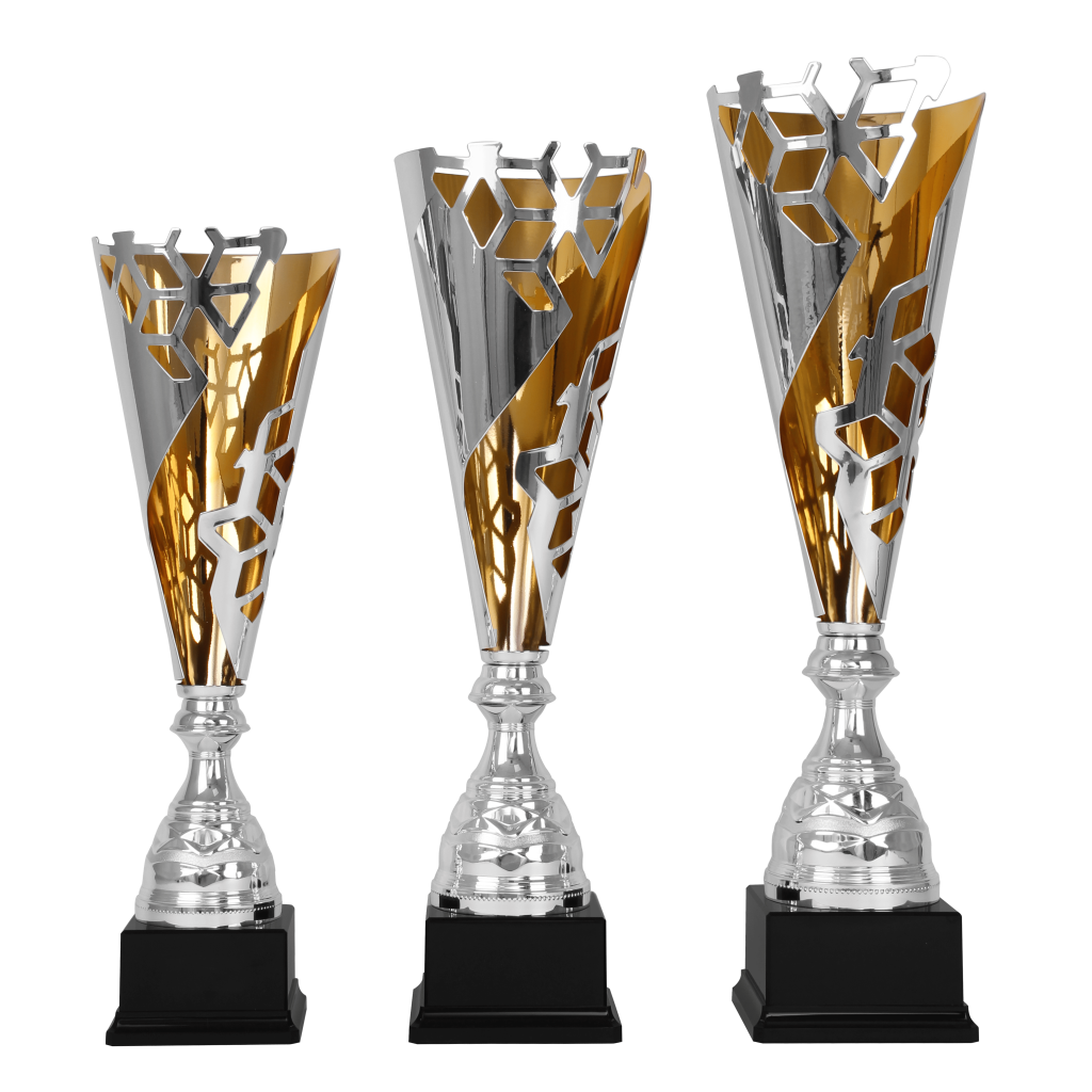 Mooie metalen trofee met goudkleurige afwerking aan de binnenzijde.