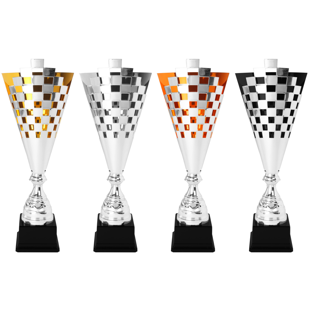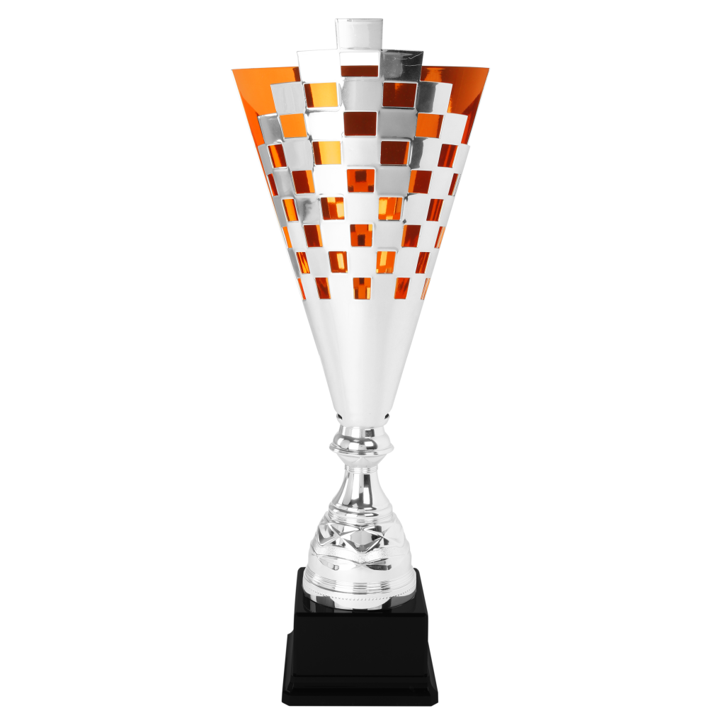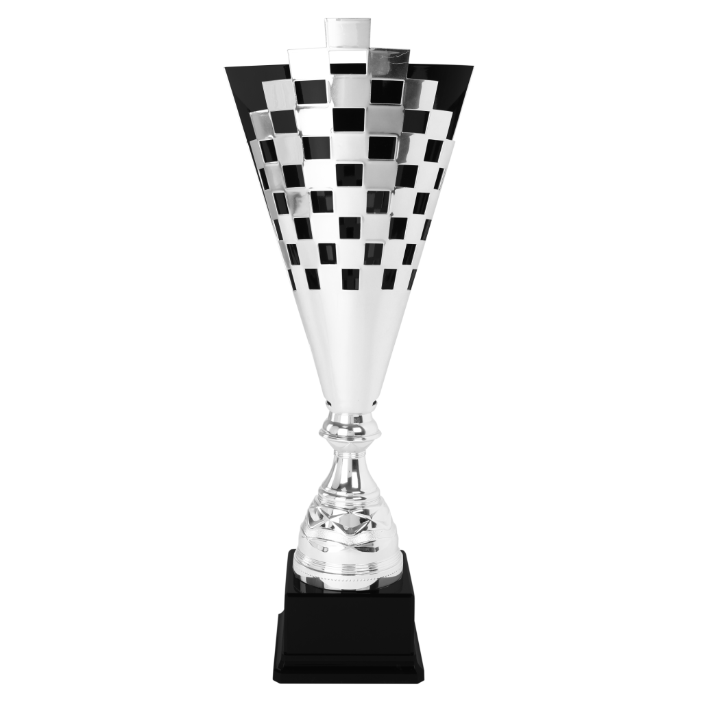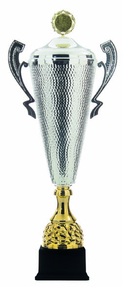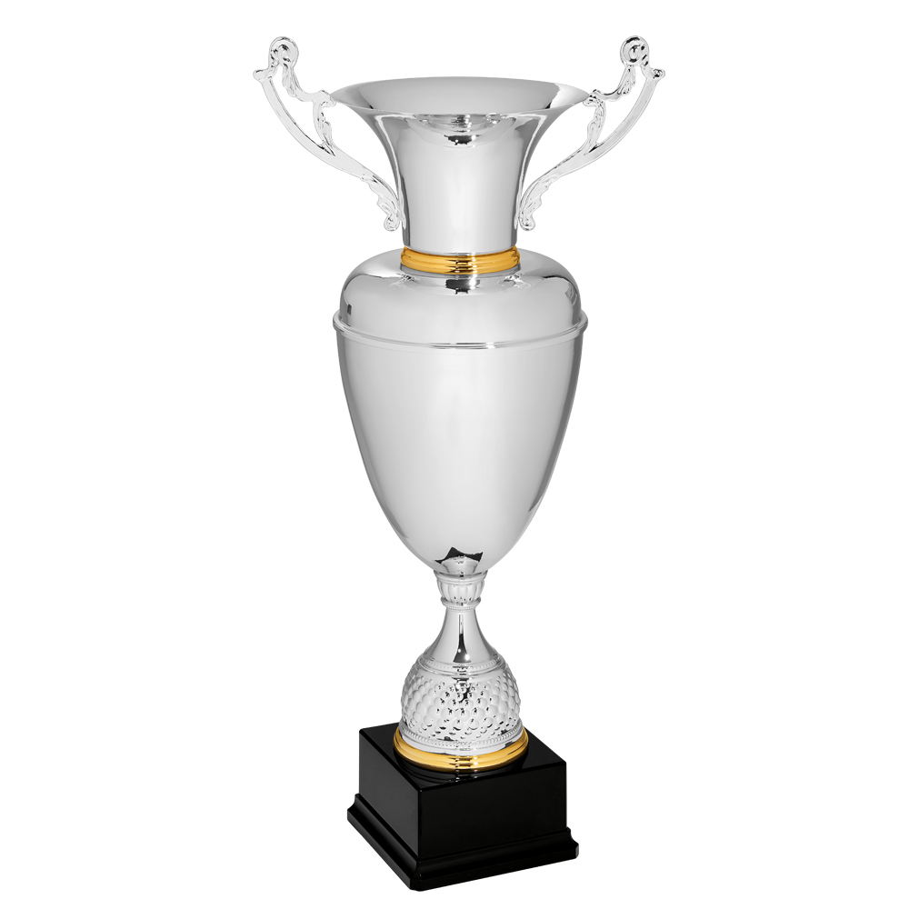 Mooie metalen trofee met goudkleurige afwerking aan de binnenzijde.